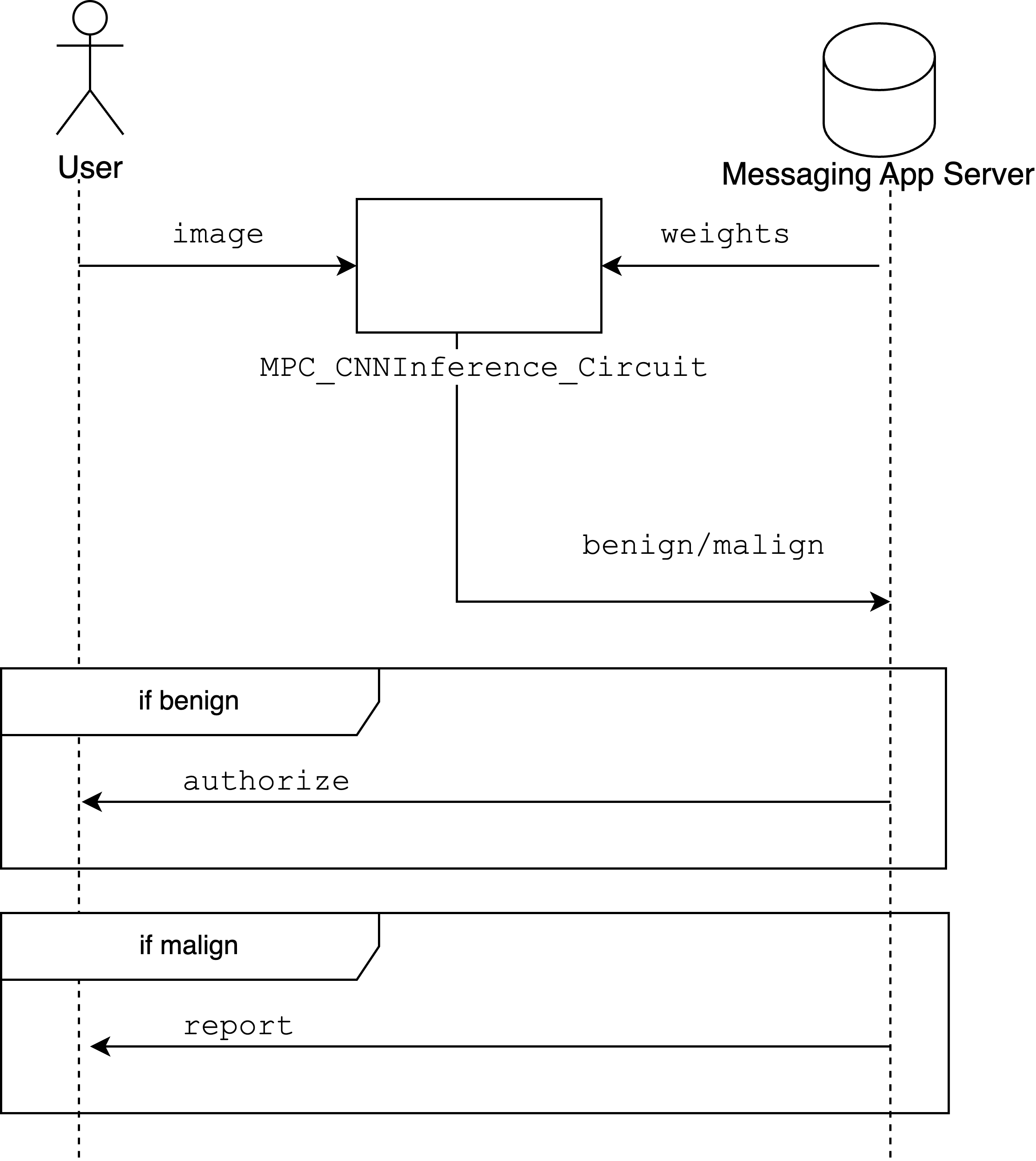 A good frame to understand MPC is by starting with a mental experiment. Let's assume the existence of a trusted and incorruptible third party to which the User and the server share their private data. This party is trusted to never reveal the secrets of one party to the other or the world. This party would then perform the CNN inference function using these inputs and only share the computation output with the public. Again, this party is trusted to perform the computation correctly.